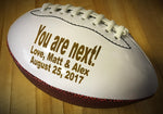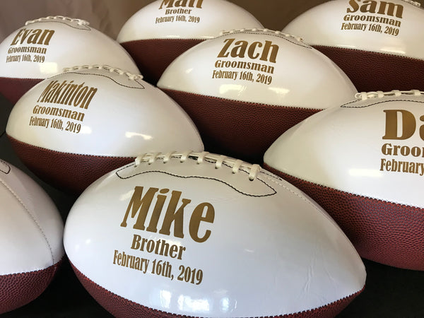 These Laser Engraved personalized Mini, Youth or Full size footballs are a great gift for Ring Bearers, Groomsmen, Sports Teams, Birthdays, Christmas Gifts, Baby Showers, Birth Announcements, Graduations, Keepsakes, Promotional Items or any other special occasion.